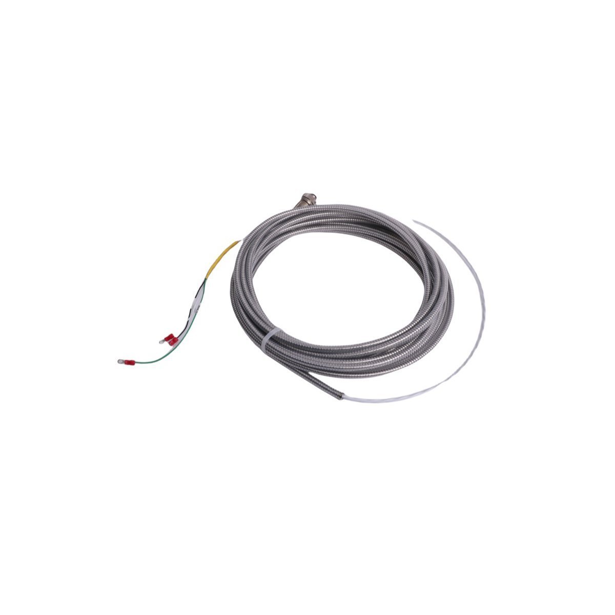 The Bently Nevada 84661-67 is a specialized interconnect cable engineered for the transmission of low-level analog signals from Velomitor piezo-velocity sensors to a machinery protection system. Its primary function is to provide a reliable, noise-immune physical link between a sensor mounted on rotating machinery and a monitoring module, such as the Bently Nevada 3500/42M. The cable is constructed with a shielded, twisted-pair configuration using 22 AWG conductors. This design is critical for preserving the integrity of the millivolt-level velocity signal by minimizing interference from electromagnetic (EMI) and radio frequency (RFI) sources common in industrial environments. The 84661-67 cable transmits the dynamic voltage signal proportional to the machine's case vibration velocity, enabling the 3500 system to perform accurate vibration analysis and machinery diagnostics. The cable features a ruggedized jacket for resistance to industrial chemicals and abrasion, and its specific length and connectorization are designed for seamless integration without field modification, ensuring consistent system performance and measurement accuracy.